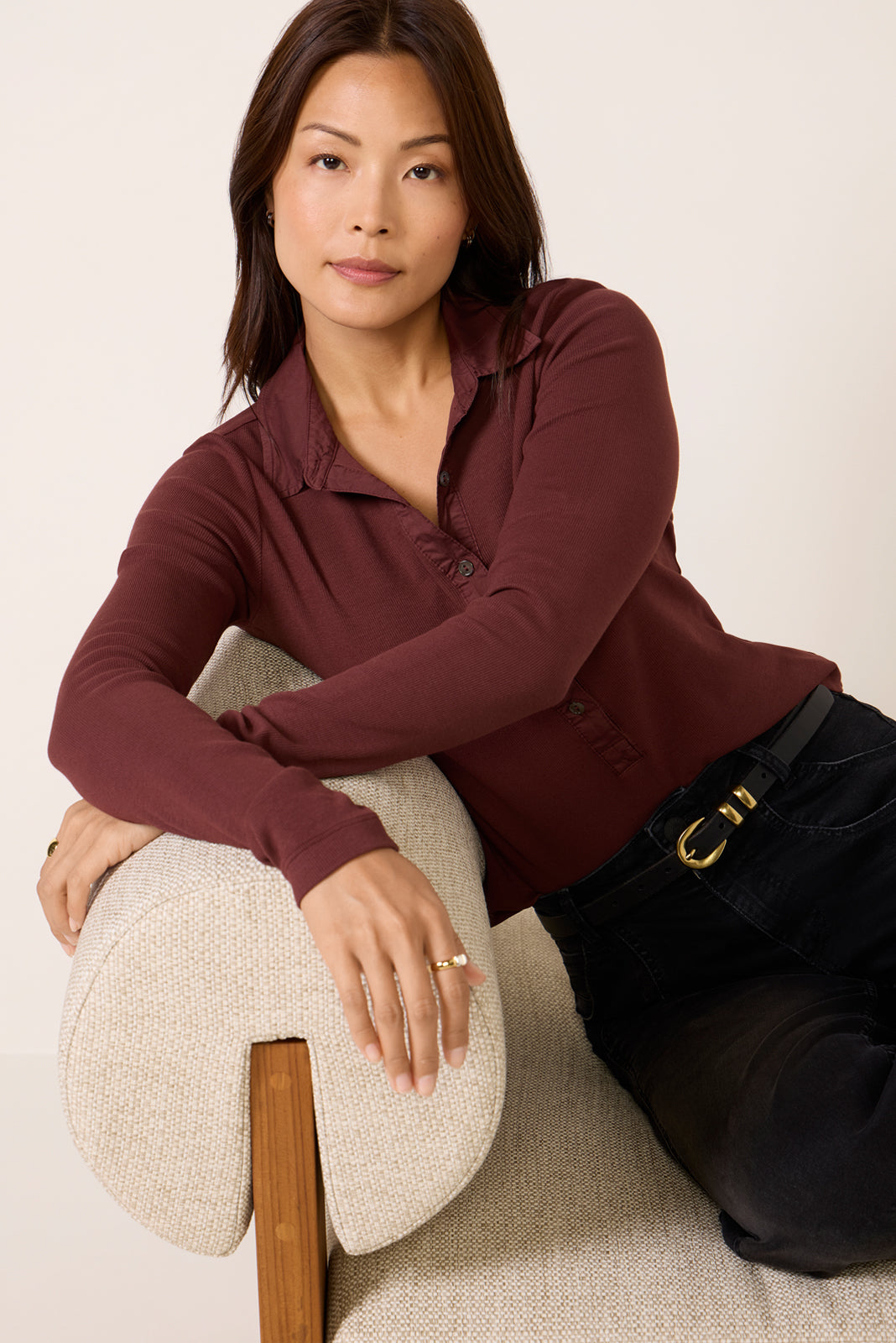 Buttery soft and oh-so-versatile. the Arvine Top by Velvet features a pointed collar. partial front buttons. and a fitted silhouette that’s perfect for adding your favorite layers.